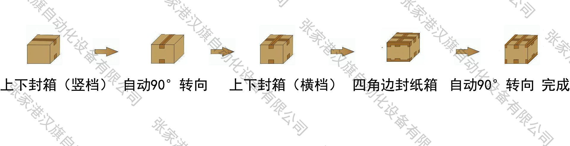 我公司的全自动封箱机线包含两个旋转顶升机,两台中封机,一台角封机,一台中间校位机。